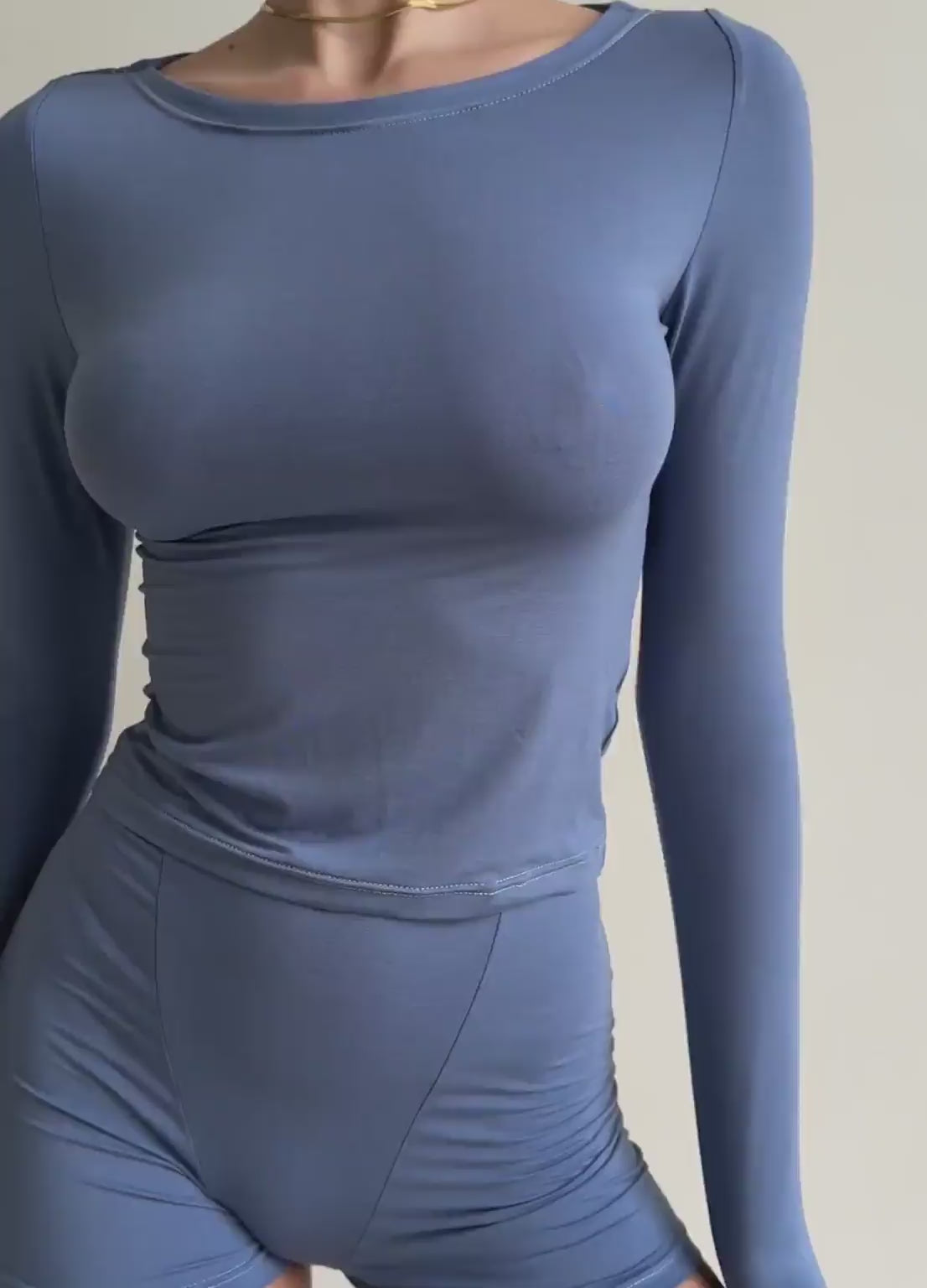 - Top: Fitted long-sleeve shirt with a round neckline and extended sleeves featuring thumb holes.