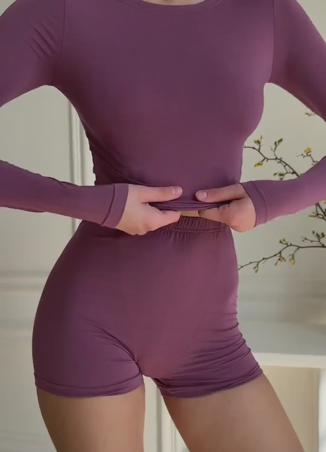 - Bottom: Elastic shorts with a soft waistband that allow free movement and highlight the silhouette.